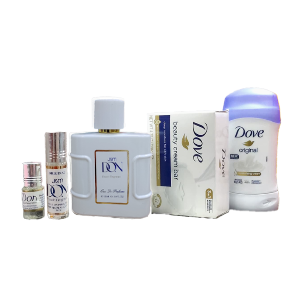 مجموعة العناية الشخصية اليومية صابون دوف +مزيل عرق دوف + عطر دون الابيض من JSM + عطر دون رول 6مل من JSM + عطر دون رول 2.5مل