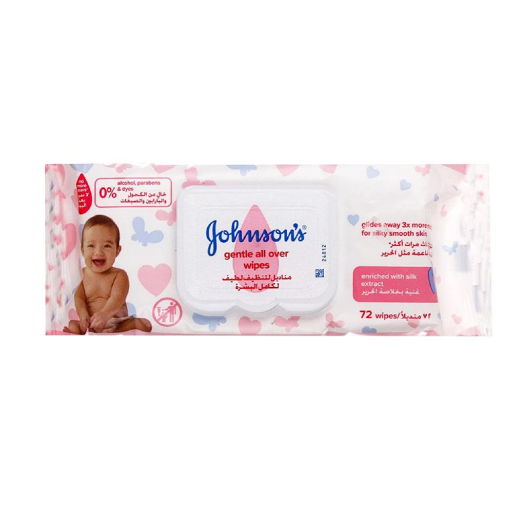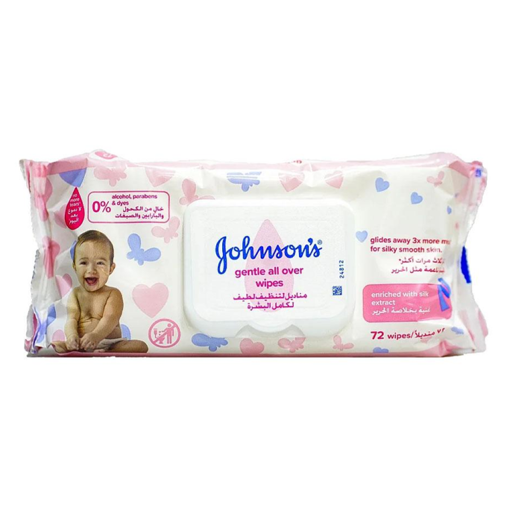 جونسون مناديل لتنظيف لطيف لكامل بشرة الاطفال 72 منديل هي مناديل مضادة للحساسية يمكن استخدامها لتنظيف جسم الطفل بالكامل ، حتى الوجه و بدون حرق العينين مع تقنية لا دموع بعد اليوم ، يمنع التهيج والطفح الجلدي ، مما يترك بشرة الطفل رطبة ويحافظ على حواجز الجلد الطبيعية.