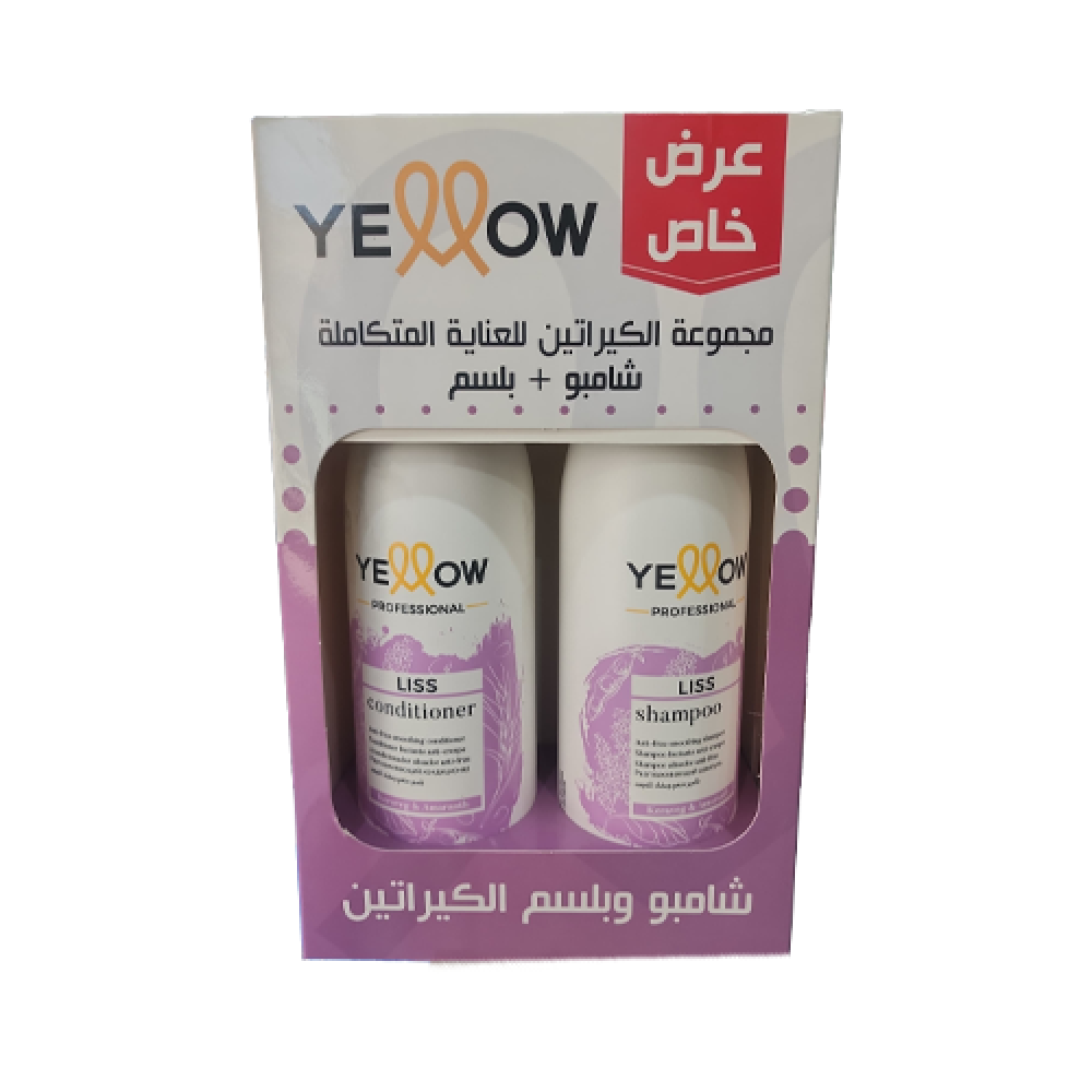 امنحي شعركِ تجربة عناية احترافية في المنزل مع مجموعة YELLOW KERATIN للشعر المعالج بالكيراتين، والمكوّنة من شامبو وبلسم بتركيبة فعّالة تعمل على ترميم الخصلات وتقليل التجعد ومنح الشعر نعومة ولمعانًا يدومان.